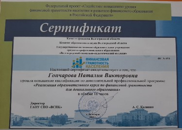 В 2021 году прошла повышение квалификации в государственном автономном профессиональном образовательном учреждении «Волгоградский социально-педагогический колледж по дополнительной профессиональной программе «Реализация образовательного курса по финансовой грамотности для дошкольного образования» Воспитанники подготовительной группы под моим руководством, приняли участие в заочном и очном этапах межрегиональной викторины для детей старшего дошкольного возраста «В мире финансовой грамотности». Викторину провёл МАДОУ д/с №20 г.Калининграда в рамках программы Министерства финансов Калининградской области. Из 56 команд участников викторины, наша команда «Весёлый бизнесмен» вошла в десятку сильнейших и стала ЛАУРЕАТОМ. В ноябре 2021 года стала делегатом ежегодной Невской Образовательной Ассамблеи в г. Санкт-Петербург. На 5 Всероссийской конференции: «Парадигма инновационной системы образования: будущее рождается сегодня» награждена ДИПЛОМОМ лауреата Всероссийского конкурса «Образовательная организация 21 века. Лига лидеров-2021» в номинации: «Педагог- новатор 2021» Занимаюсь самообразованием, усовершенствую свои знания, умения и навыки по данной теме.